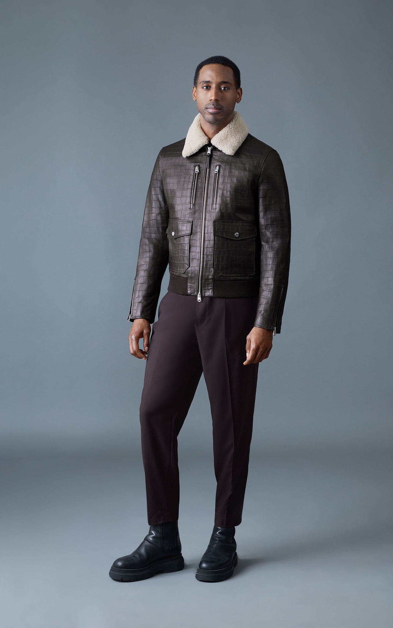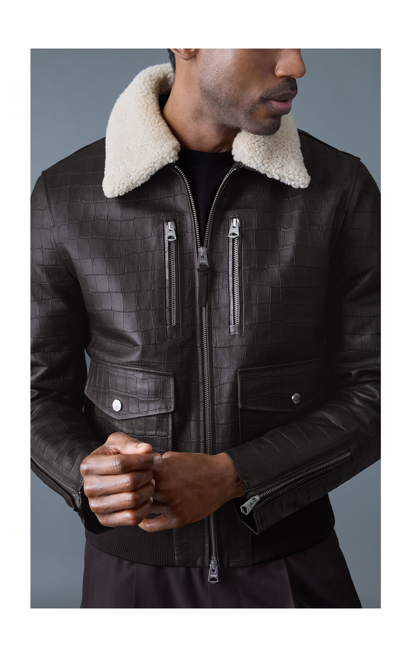 ネックラインから見えるコントラストが効いた羊革が男性らしさを演出します。