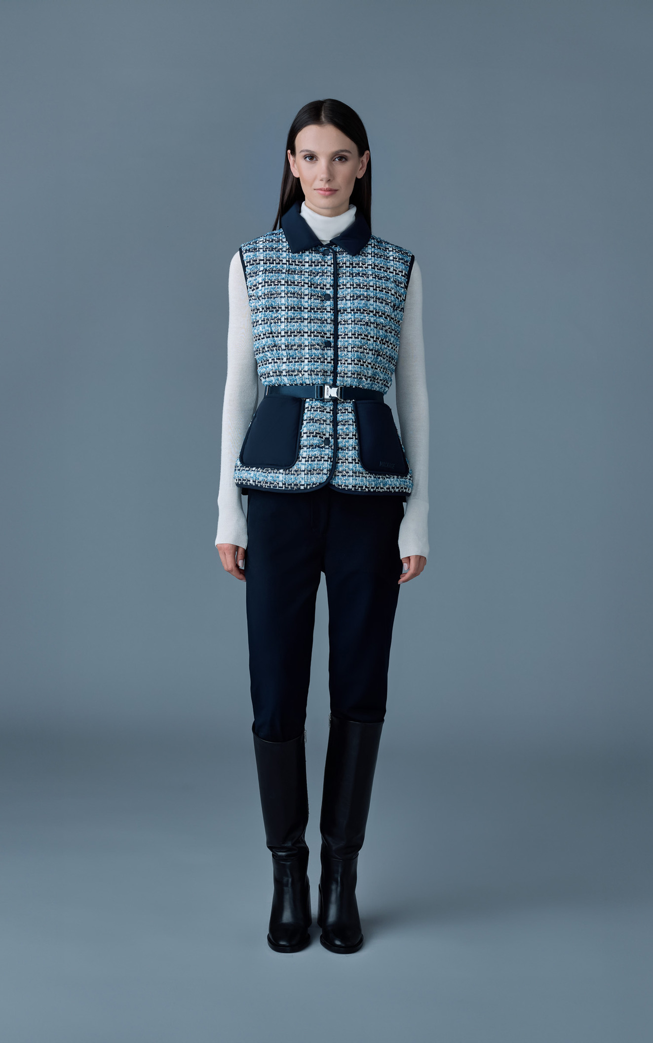FRANCINE-TWは、ラグジュアリー感のあるシルバーとブルー系のツイードダウンベストです。