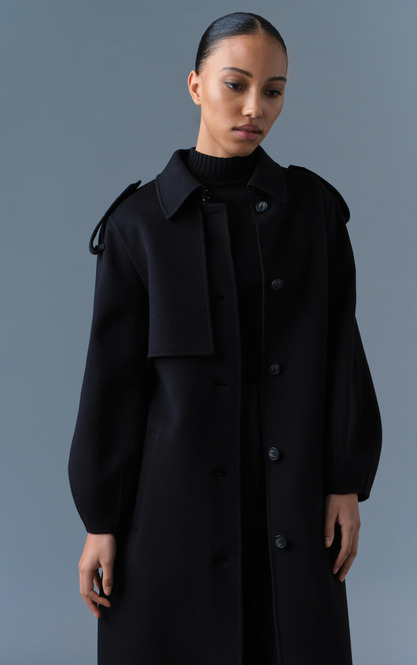 ストレートフィットのシルエットをサッシュベルトで際立たせ、ダーツ付きのバルーンスリーブがモダンな雰囲気をプラスします。