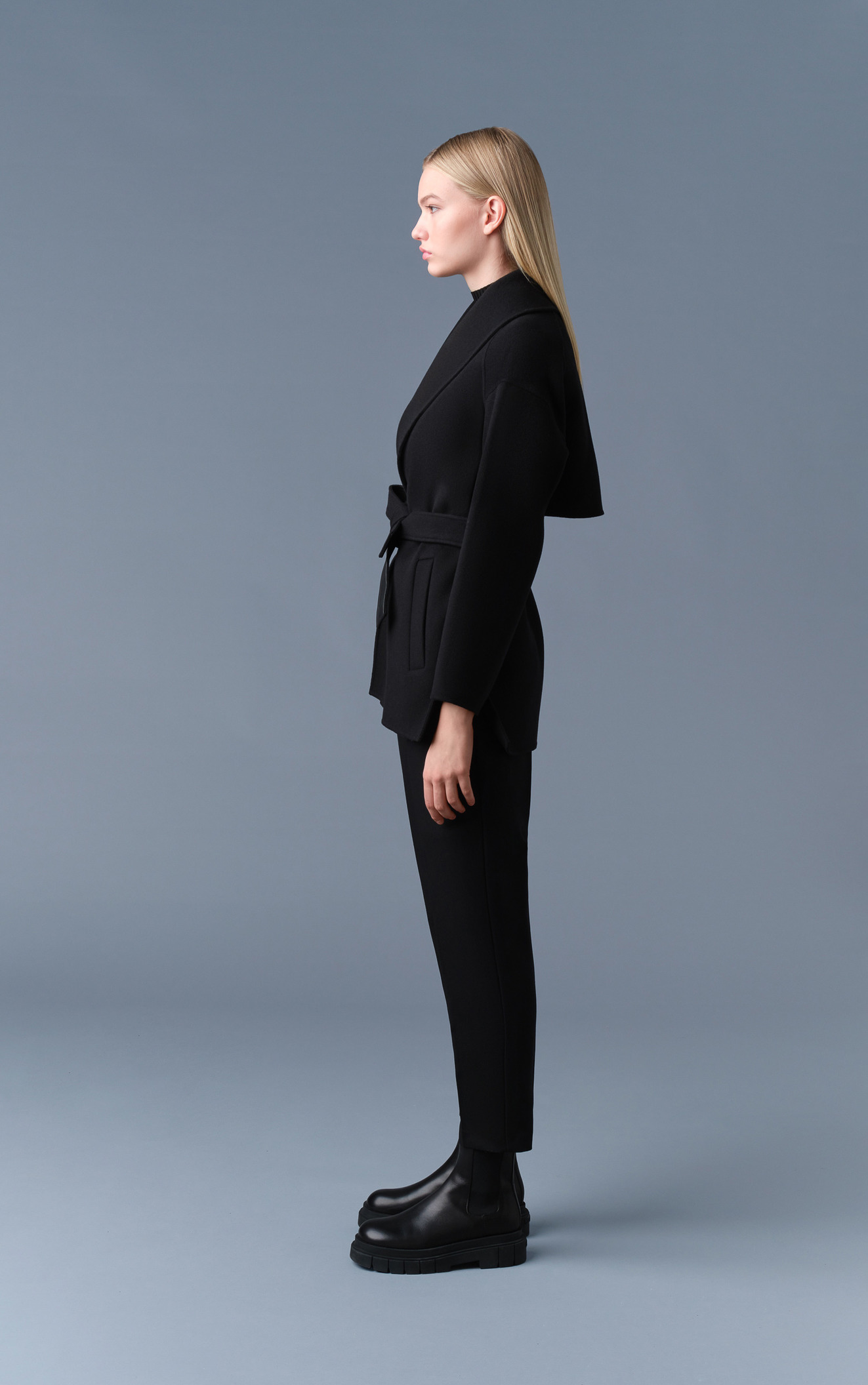 TYRAは、ローブシルエットとショールカラーのダブルフェイスウールラップジャケットです。