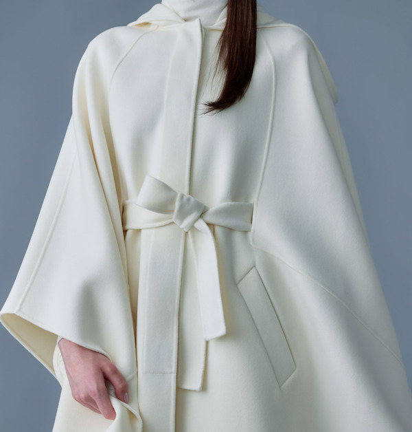 ゆったりとしたポンチョ型のシルエットが特徴。ウエストのベルトを締めることで流動的なドレープ感が際立ちます。