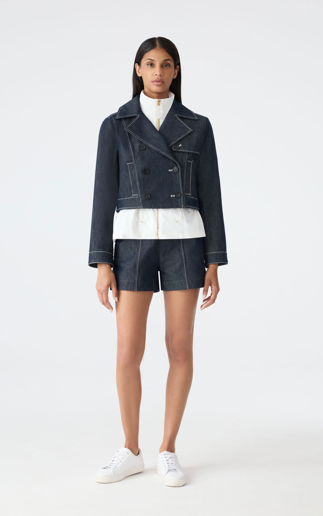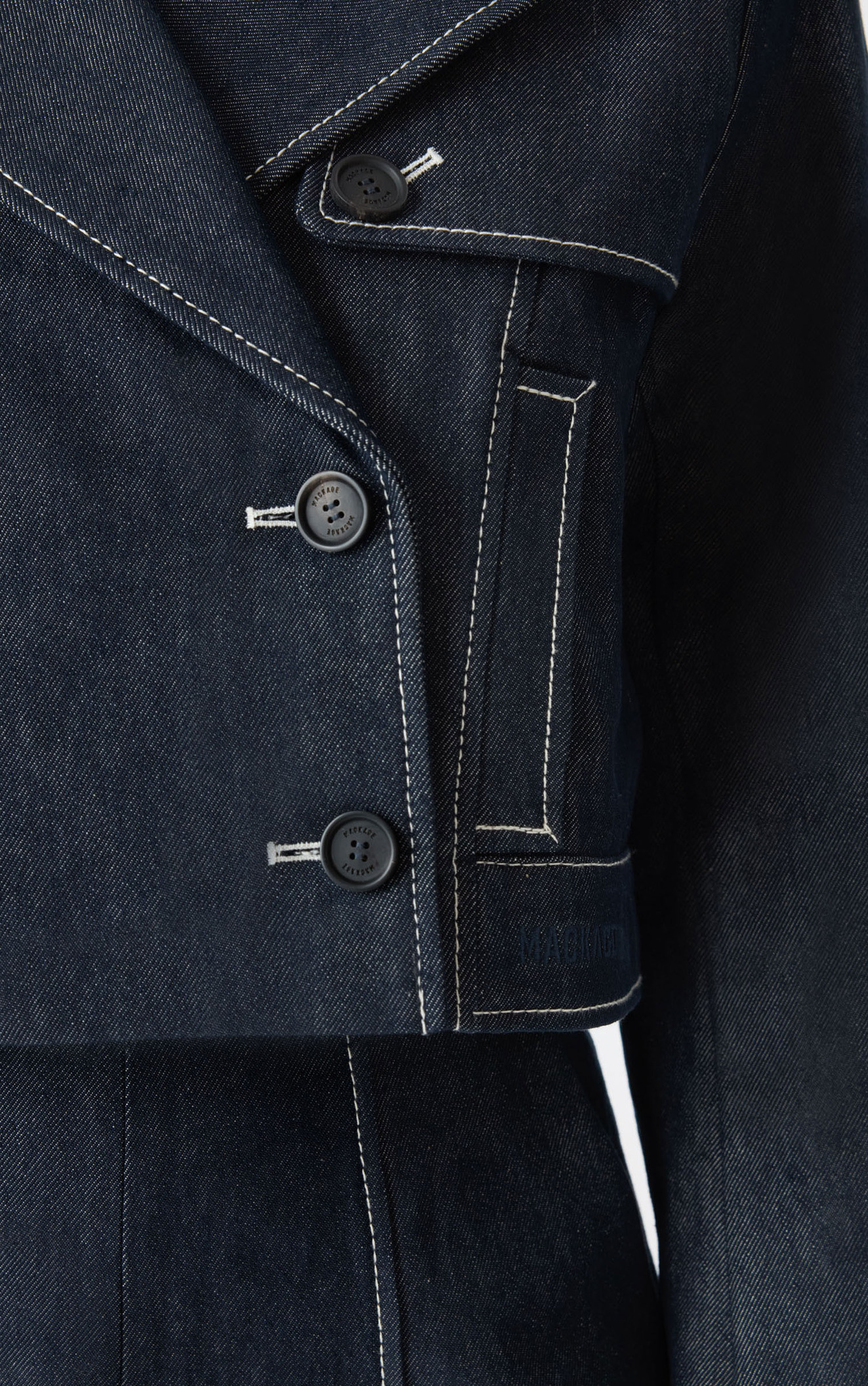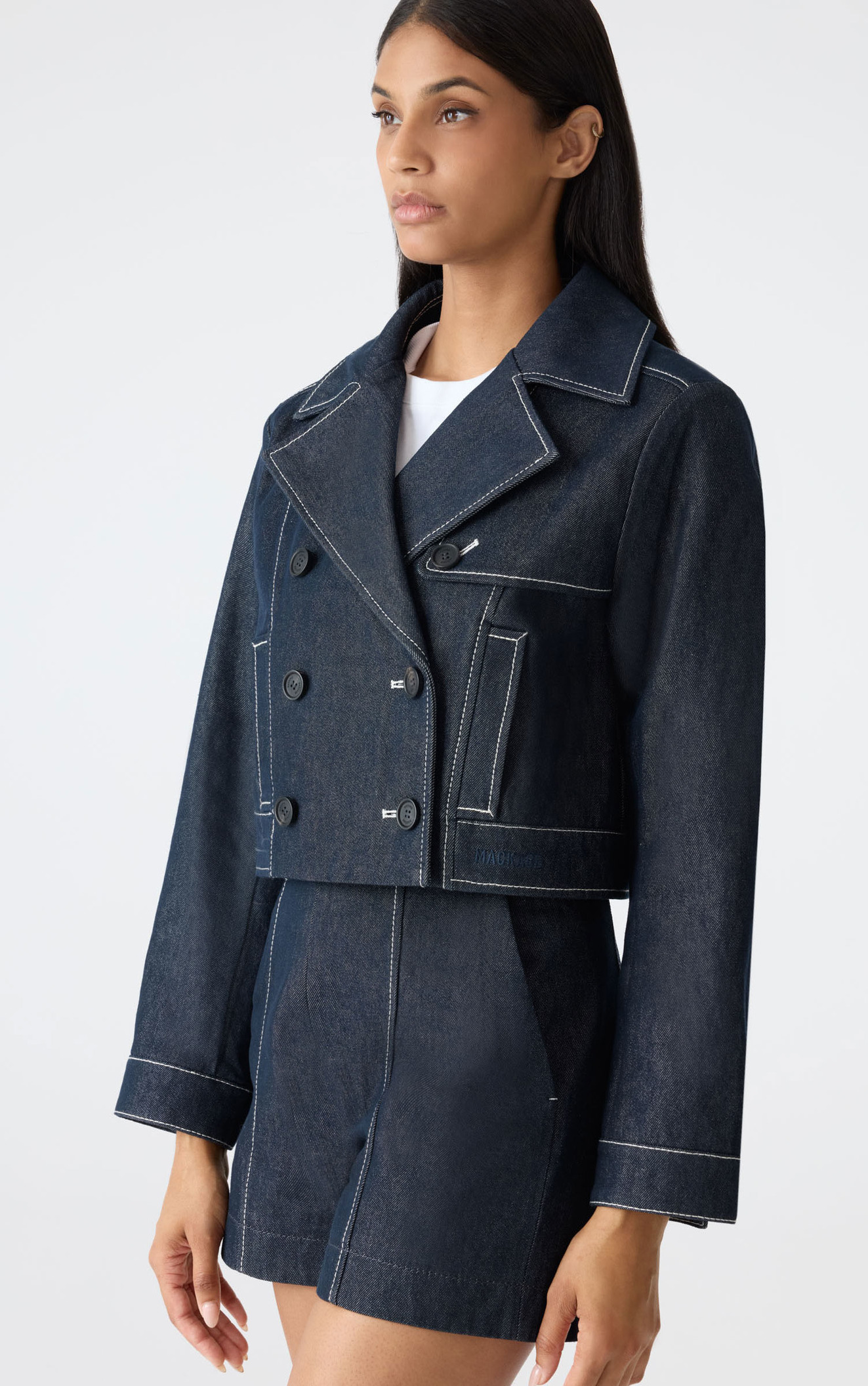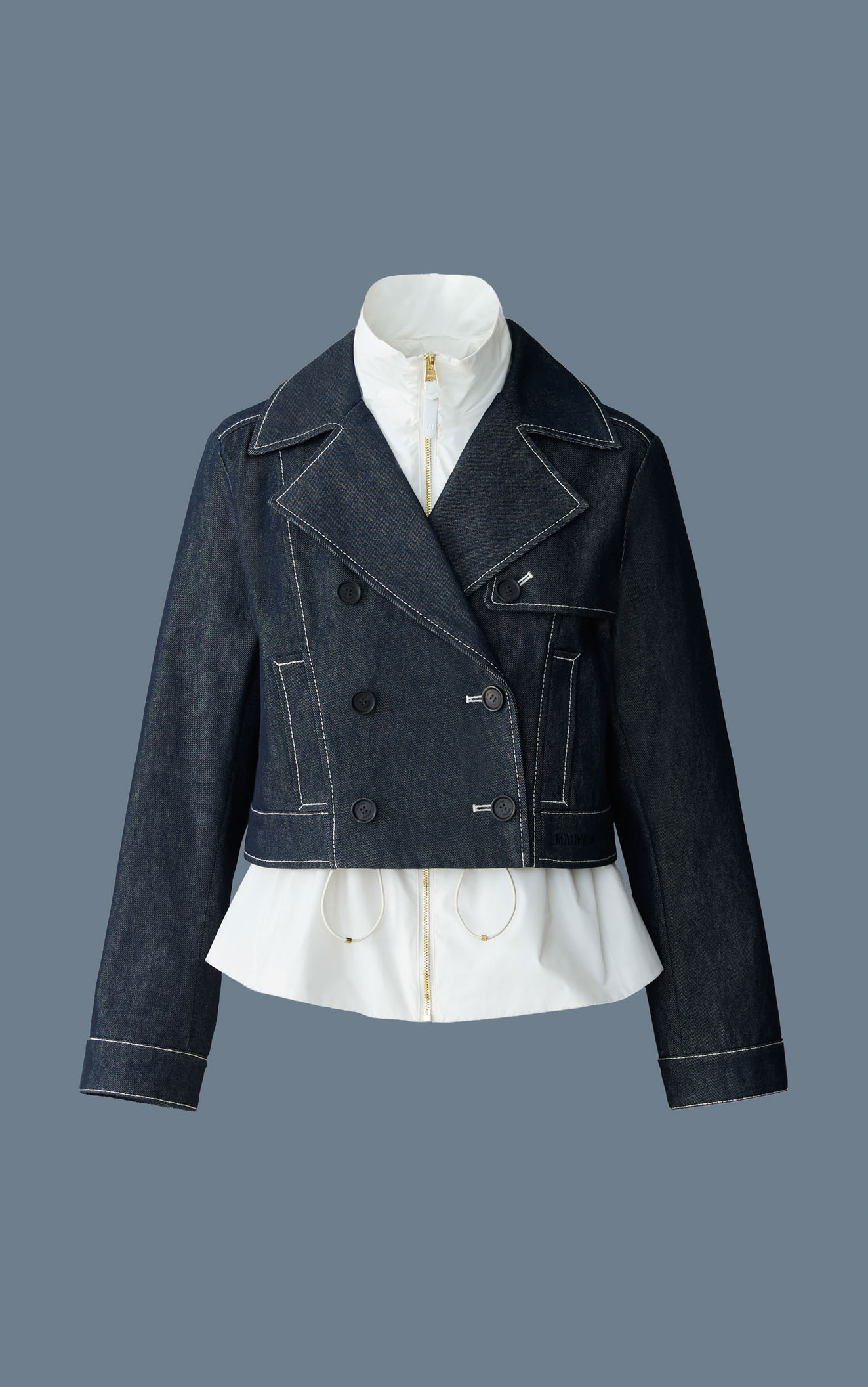 ショート丈のダブルブレストのデニムジャケットとペプラムのインナーの組み合わせがMACKAGEらしさを感じさせます。