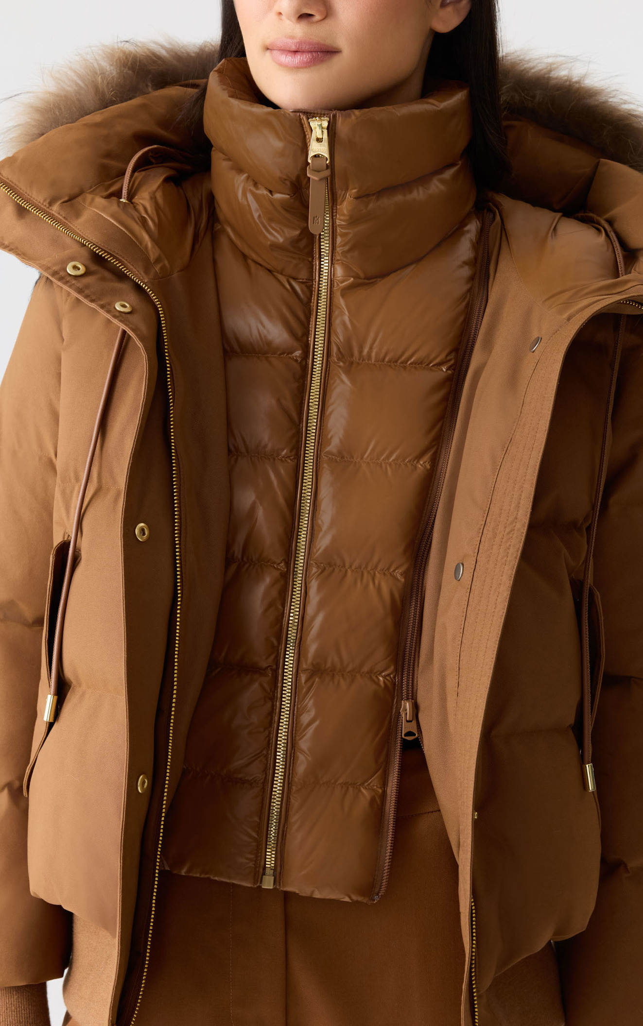 2つの異なる生地のレイヤー仕様。取り外し可能なライトダウンのレイヤーで、気温によって暖かさを調節できます。