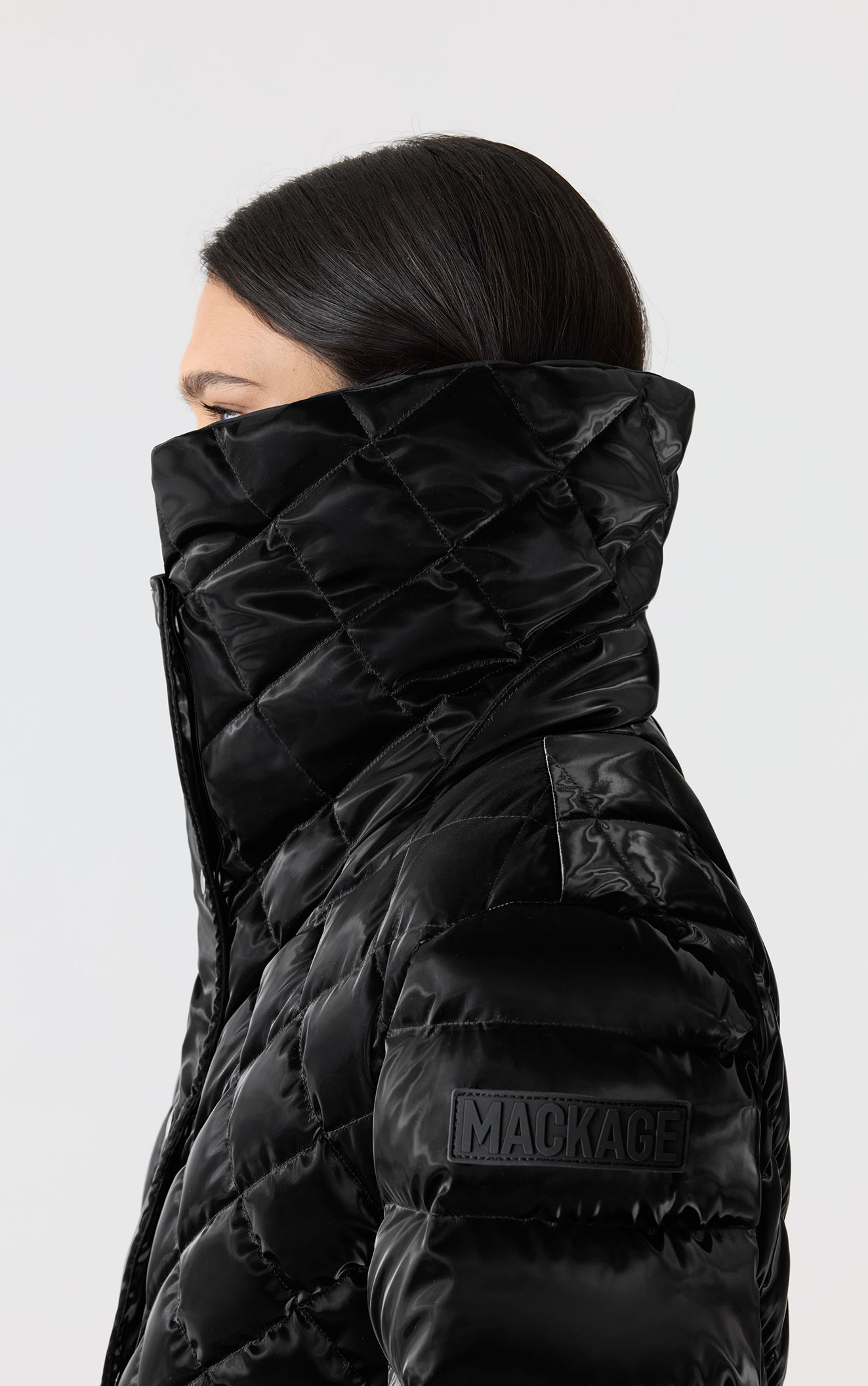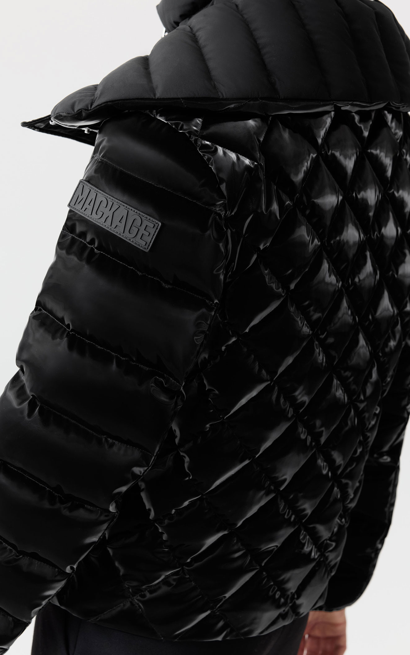 トレンド感のあるダイヤモンドキルトに光沢感のあるシェルをあしらい、アクセントを加えています。