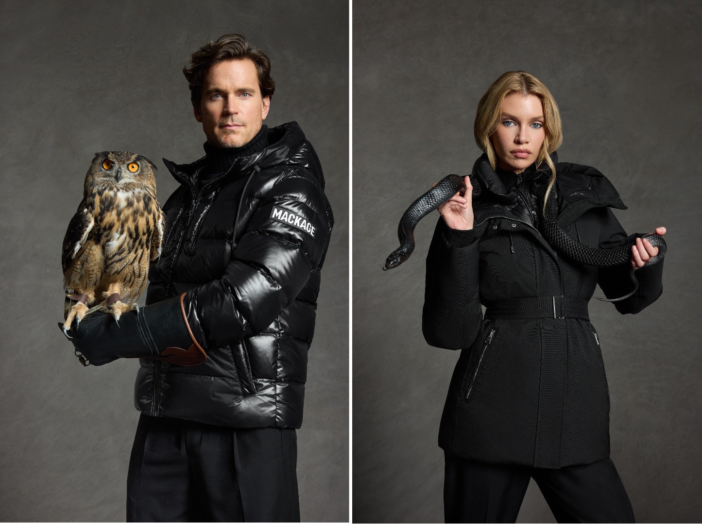 撮影には、フクロウ、ハヤブサ、インディゴスネーク、そして2匹のドーベルマンという印象的な動物も登場、これらはMACKAGEのDNAを象徴しています。フクロウは「知恵」、ハヤブサは「精密さ」、ドーベルマンは「献身」、そしてヘビは「保護」を表し、それらが「Aesthetics That Protect(美しさと機能性の両立)」というブランドの理念を視覚的に表現しています。